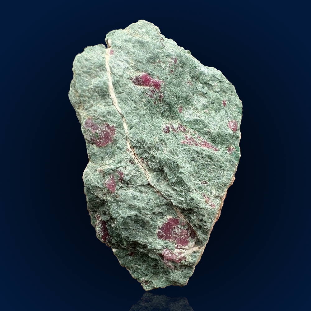 A specimen featuring several red ruby corundum crystals neatly nested inside the characteristic for this Greek locality green pargasitic matrix. Field-collected in April 2023.
