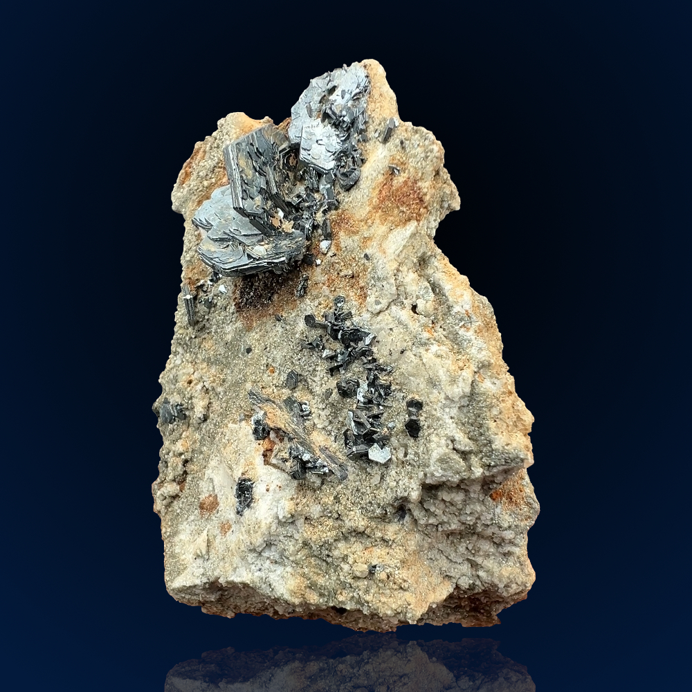 A spectacular Swiss specimen featuring hexagonal, tabular hematite crystals of various sizes scattered across a granitic matrix. From a lesser-known Swiss locality. Found in 2022.