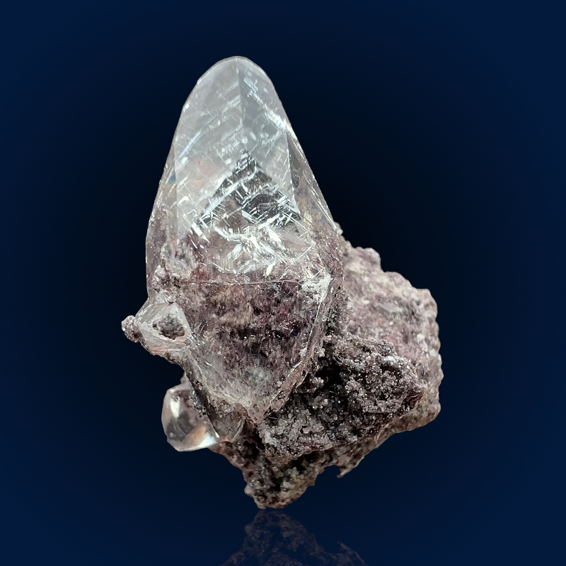 A well-crystallized, transparent and lustrous calcite crystal form the renowned N’Chwaning mines in South Africa! The main calcite crystal is twinned but there is also a second minor twin calcite in the back!