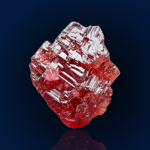 A small little gem from the Navegadora claim in Brazil! Highly lustrous and vividly red colored spessartine garnet! The structural appearance of the crystal’s faces are most likely a result of etching processes!