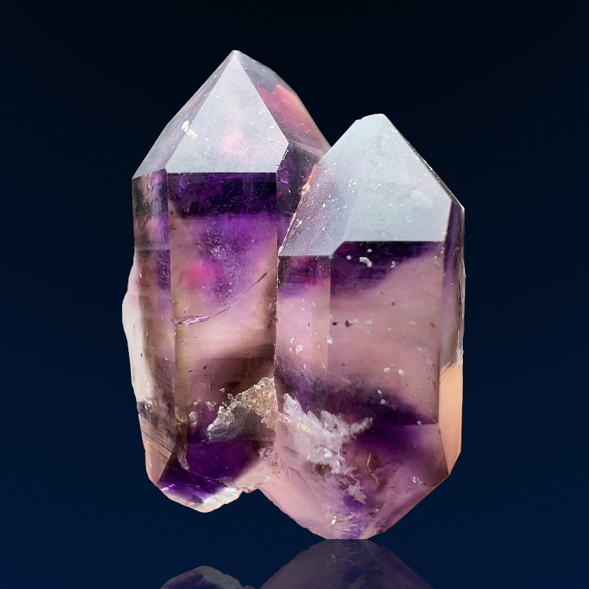 A cute specimen of two amethyst crystals that have grown side by side! This piece comes from the prolific Goboboseb Mountains in Namibia, a locality known for producing some of the finest amethysts in the world. Both crystals are doubly terminated, with rich purple tips that fade into clear quartz in the middle — nature’s perfect gradient!