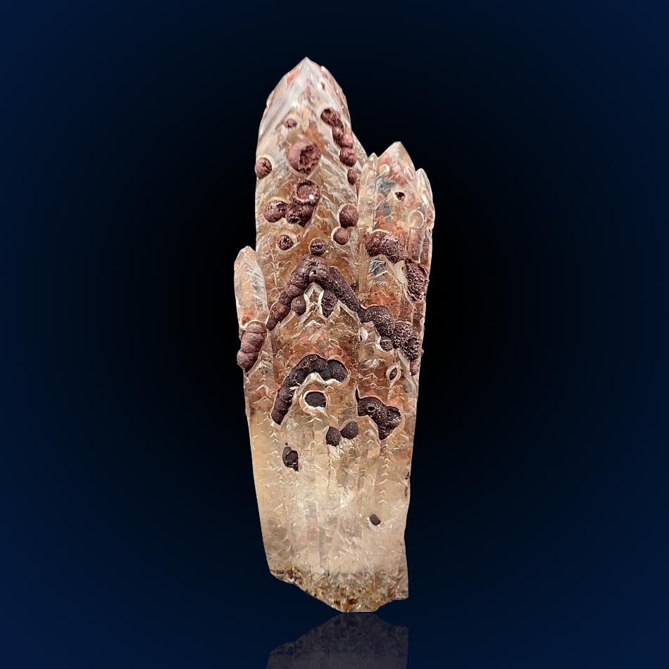Although the Tsumeb mine has been closed since 1996, specimens from this locality still circulate on the market in great numbers. Despite the abundance of material available, this is a type of specimen not often encountered: light-yellow, translucent smithsonite crystals with a scalenohedral habit growing almost parallelly and trapping, or semi-trapping, along their growth direction several botryoidal aggregates of a secondary mineral, most likely hematite. An unusual and elegant example from this classic and historic mineral locality.