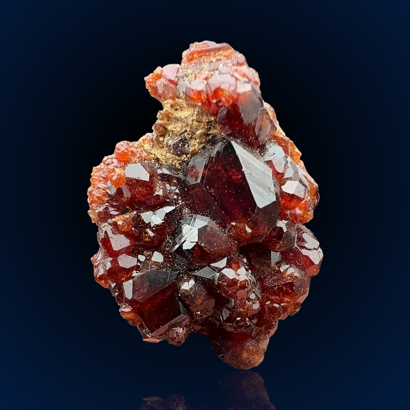 A cluster of several euhedral, deep-red hessonite grossular garnets, exhibiting vitreous lustre, translucency and sharp terminations. From Bellecombe in Aosta valley, Italy.