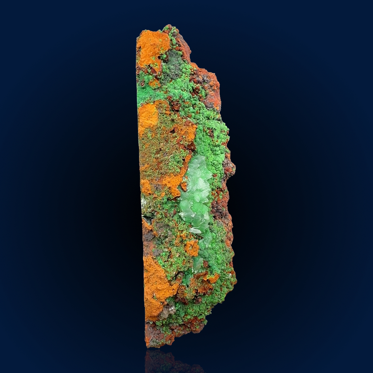 An exceptional combination specimen from the Lavrio mines in Greece. Measuring nearly 20 cm, it features a carpet of green botryoidal spherules. Analyses show that their composition lies at the midpoint of the conichalcite–austinite series, meaning one spherule may be slightly conichalcite-dominant while an adjacent one may lean toward austinite. Adding to its appeal, transparent calcite crystals form as a delicate overgrowth on the green arsenates. Beyond its visual impact, the specimen is mineralogically significant. The sawn base reveals spots of native copper—rare for Lavrio—alongside patches of tenorite and cuprite, all within a goethite–limonite matrix. Together, these phases represent a complete redox sequence of copper mineralization within a single specimen, making it a true connoisseur’s piece!