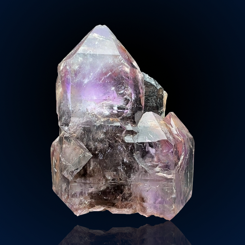 An eye-catching quartz cluster from Dasoto, Greece. A first-generation smoky quartz core is beautifully overgrown in an oriel-like fashion by a second-generation amethyst crystal, creating a striking interplay of form and color. Delicate growth features across the prism faces of the amethyst further enhance the specimen’s visual appeal.