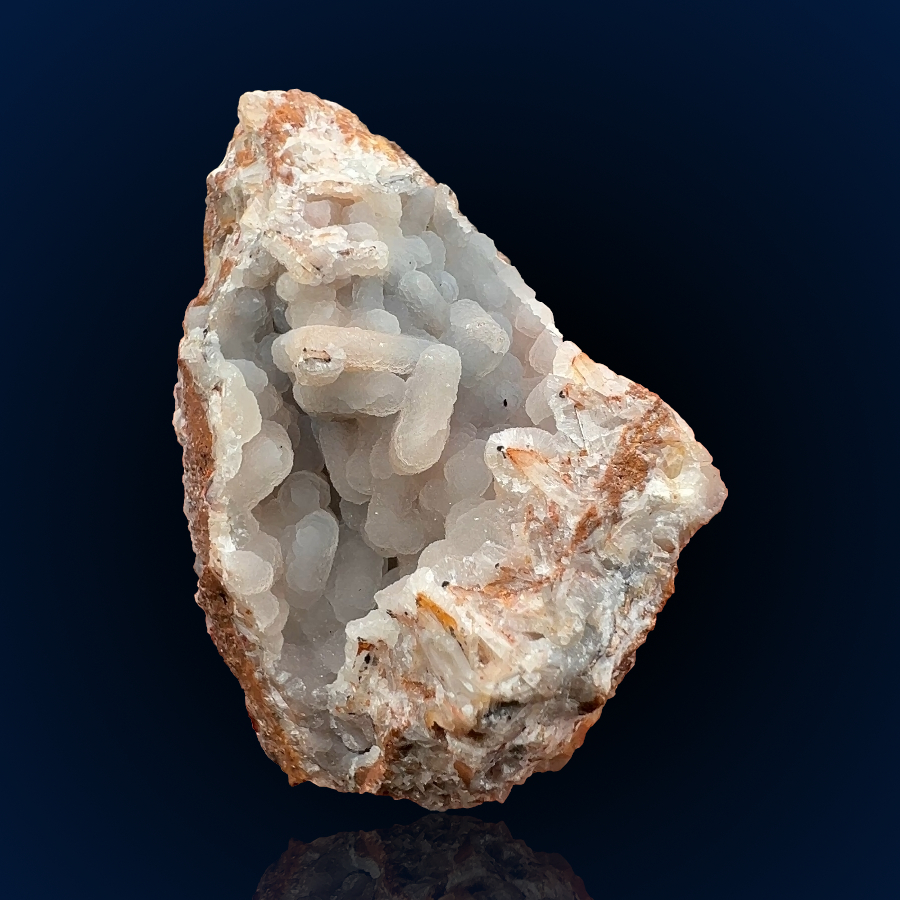 A specimen for collectors with a particular appreciation for encrustations. Finely crystallized, chalcedony-like calcite coats tabular baryte crystals. The piece comes from the prehistoric Vouves mine on the Greek island of Thasos.