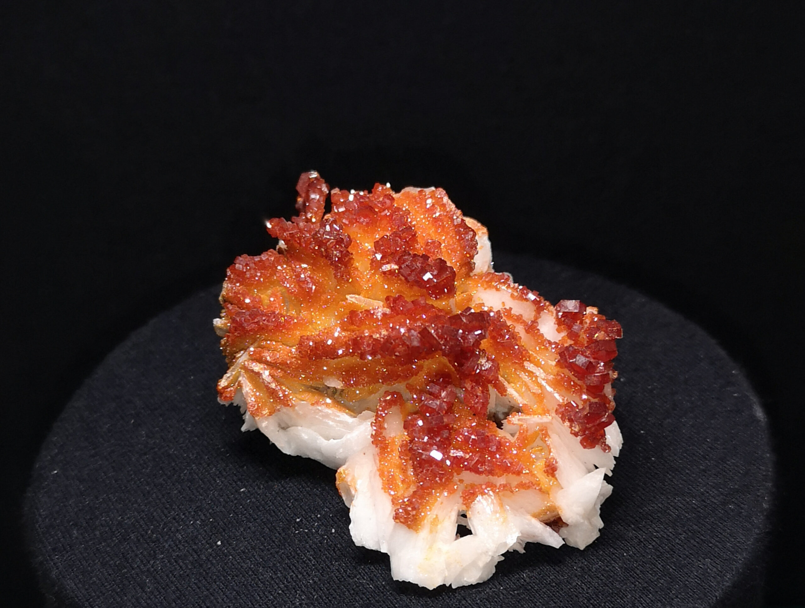 Highly lustrous vanadinite crystals of vivid bright orange color grown aesthetically over milky-white tabular baryte!
