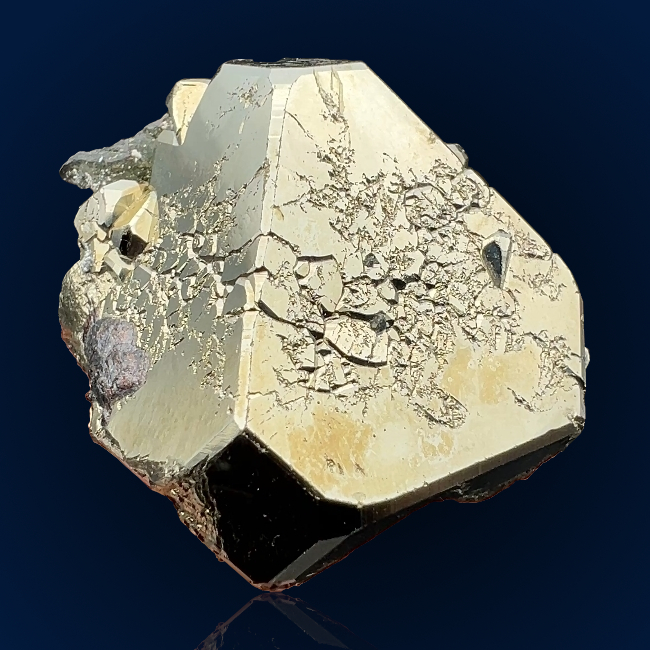 A fantastic, highly lustrous golden pyrite specimen from the prolific Huanzala mine in Peru. Smaller pyrite crystals are attached to and protrude from the main, partially developed octahedral pyrite crystal, adding depth and visual interest. Additional noteworthy features include the pitted surface texture of the pyrite and the presence of minor attached sphalerite. The attentive collector might also spot minute patches of a white mineral phase nestled here and there on the specimen. These have been reported by some miners and dealers as crandallite. That said, it is important to note that this mineral may not be primary in origin, as it can form during specimen cleaning (for example, when phosphoric acid is used), rather than being part of the original, naturally occurring paragenesis. See: mindat.org/locentry-1252883.html