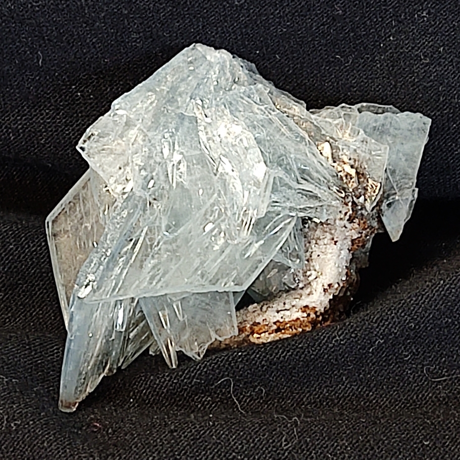 A beautiful platy baryte crystal cluster of light blue color with contrasting goethite tints!