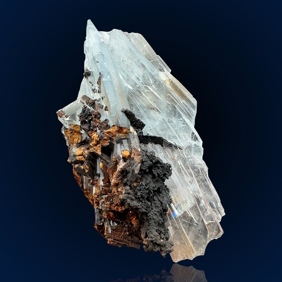 A specimen of tabular, light-blue baryte crystals exhibiting excellent lustre. Black-brown iron and manganese oxide matrix material remains attached, adding attractive contrast and visual interest.
